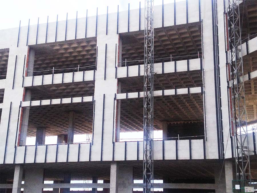 Forjado reticular con casetón de arlita para reducir peso propio y mejorar el comportamiento estructural. Pantallas de hormigón armado estratégicas para rigidizar el edificio y controlar desplazamientos por sismo y viento, especialmente relevantes dada su esbeltez.